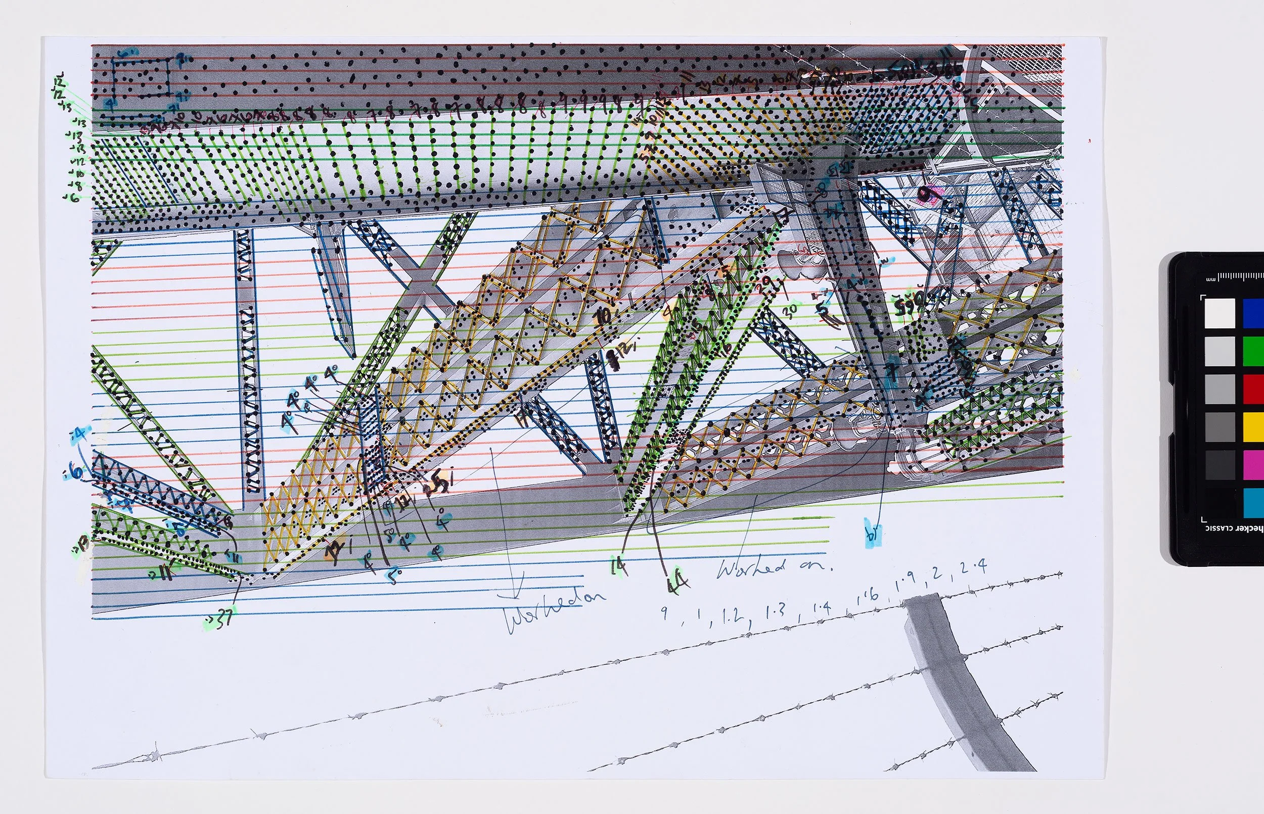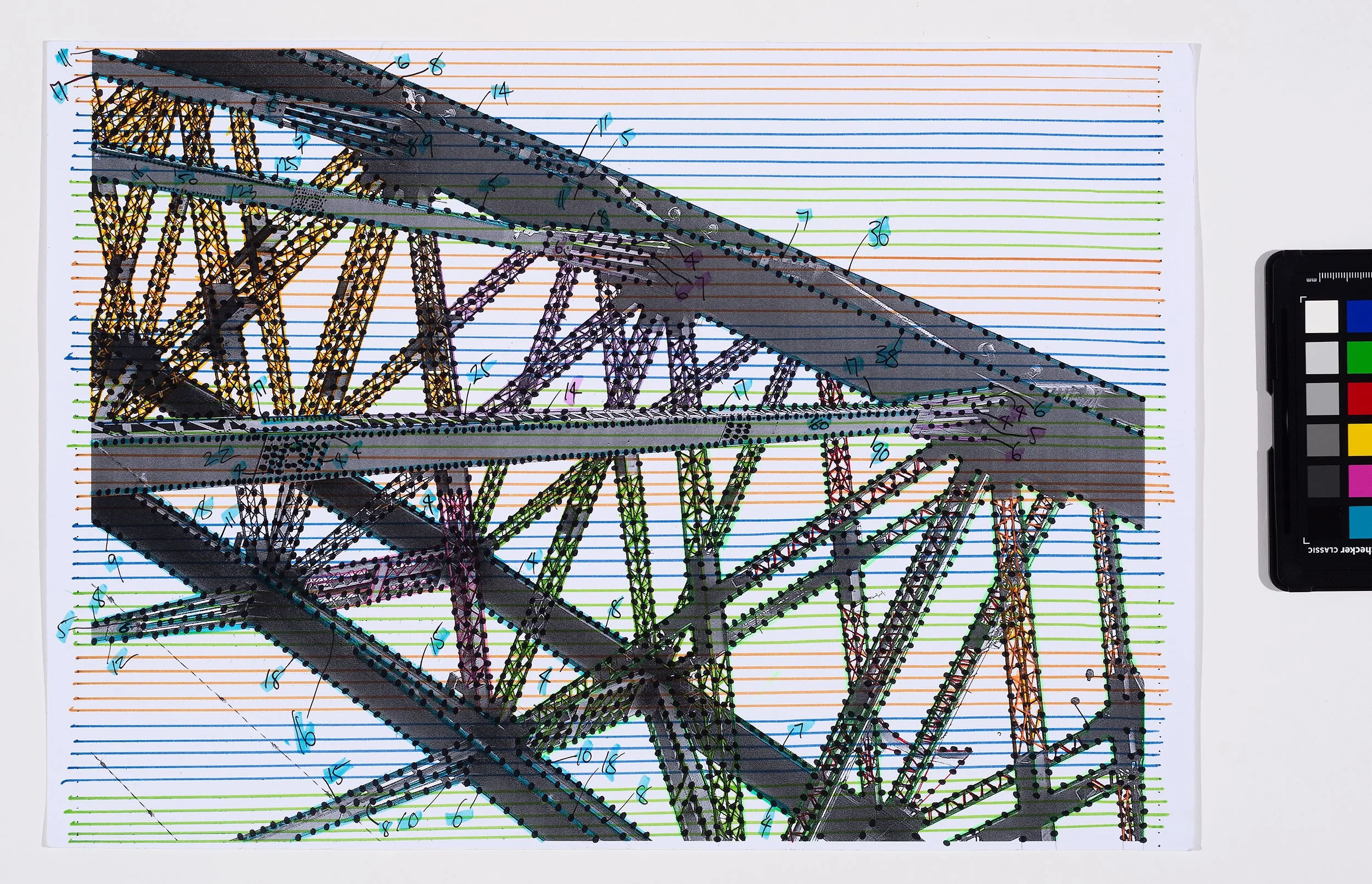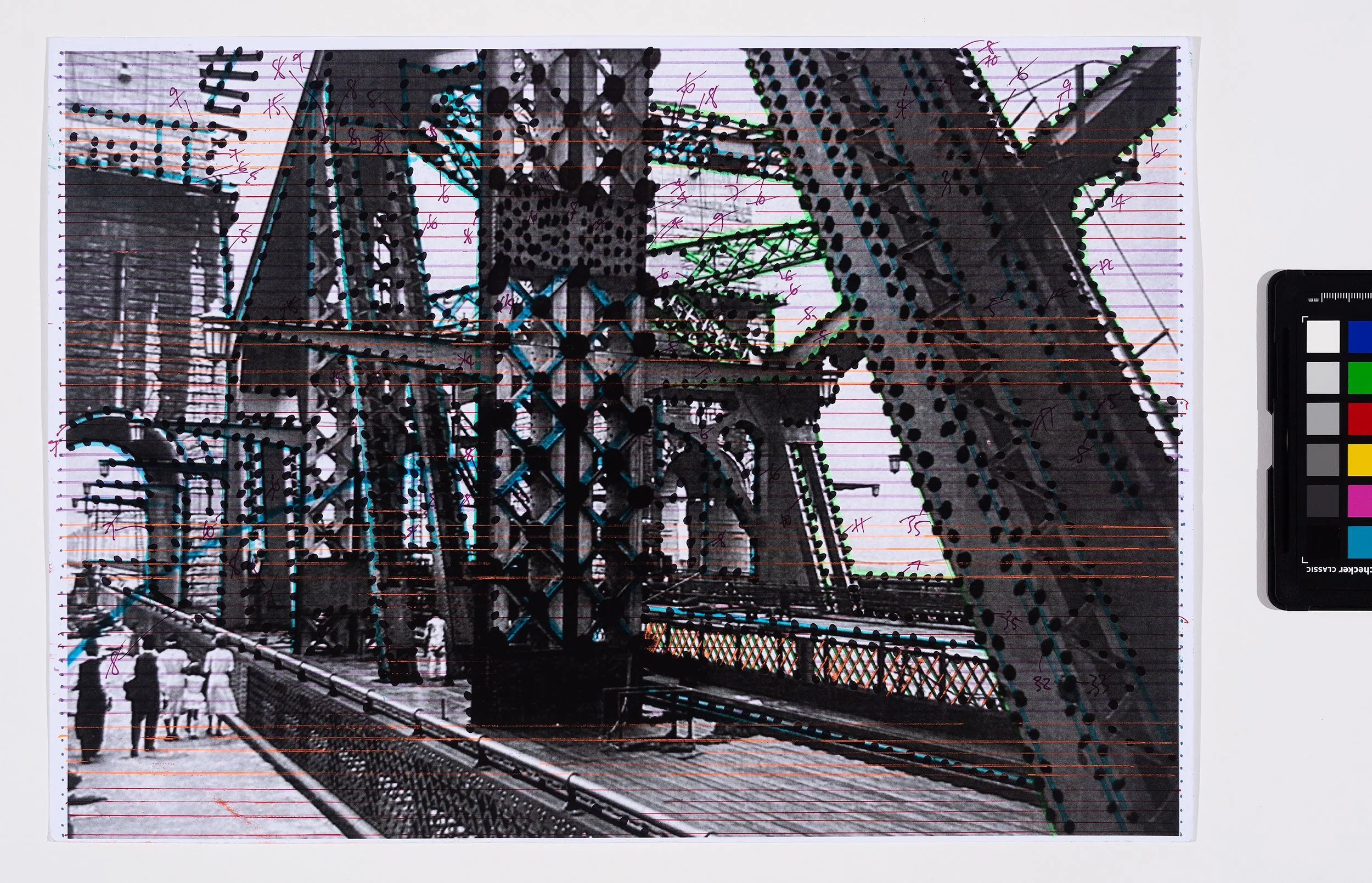 Mia Salsjö, The Bridge: A Score for Sydney Harbour Bridge, 2023, works on paper and overworked photographic prints, from the suite of images originally commissioned by the Department of Public Works, circa 1922-1932, accessed through the archive of the Powerhouse Museum, Sydney.