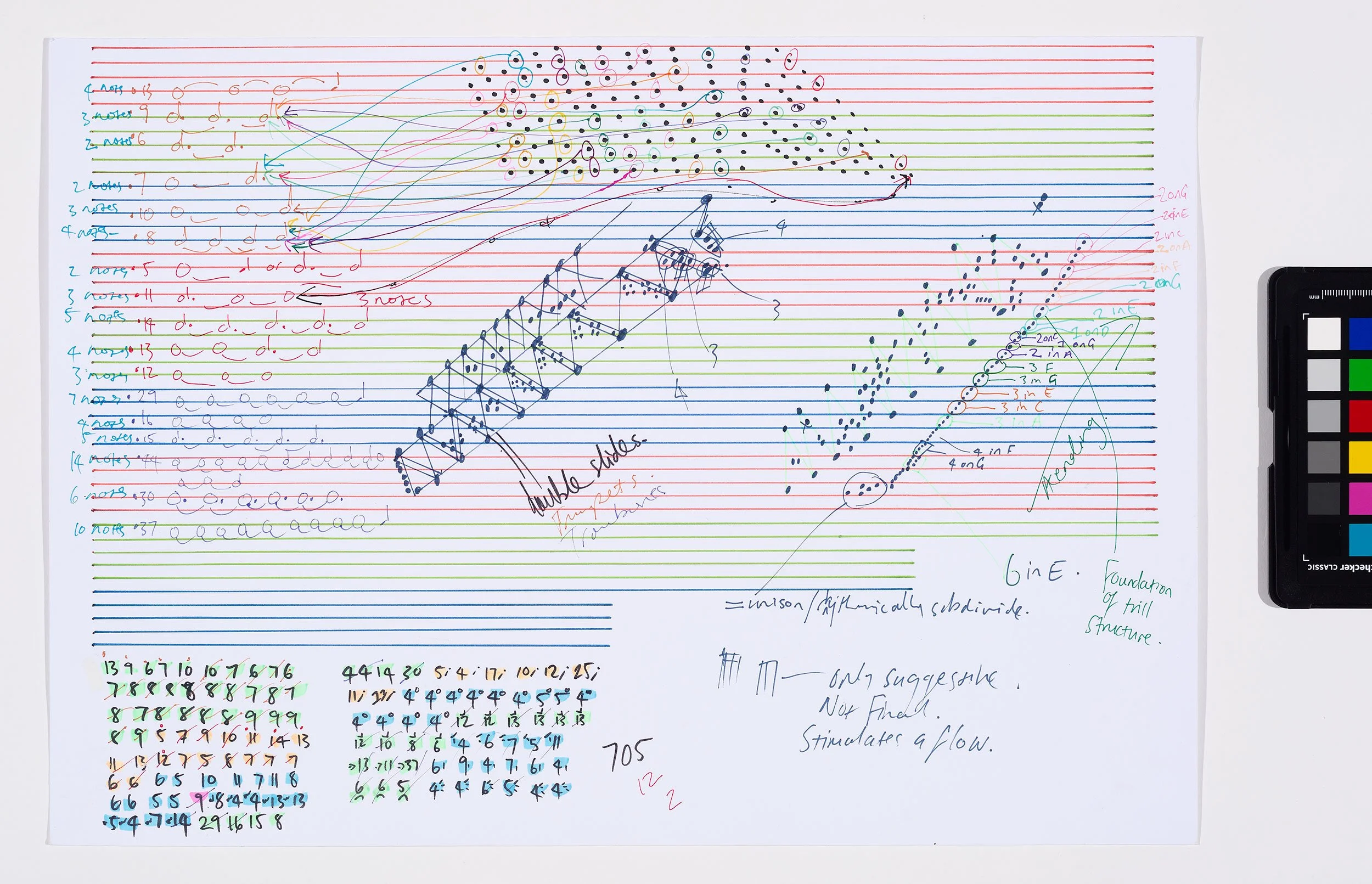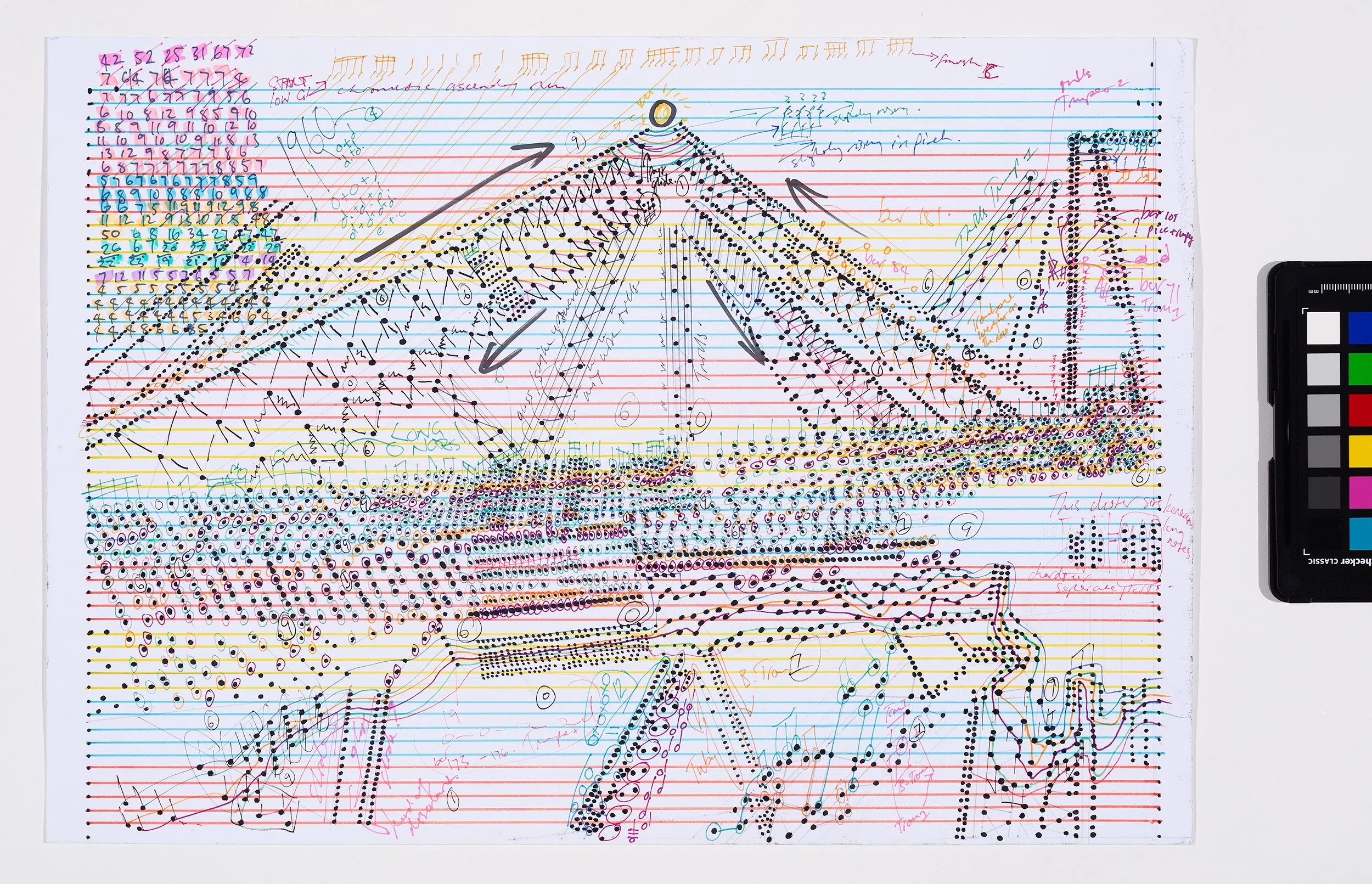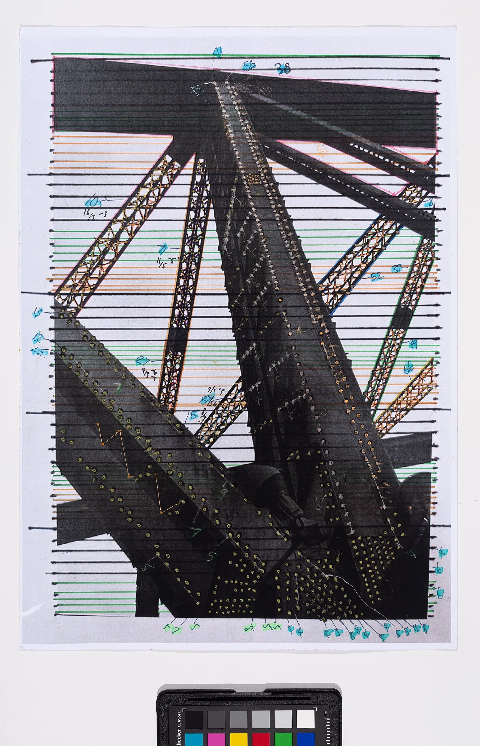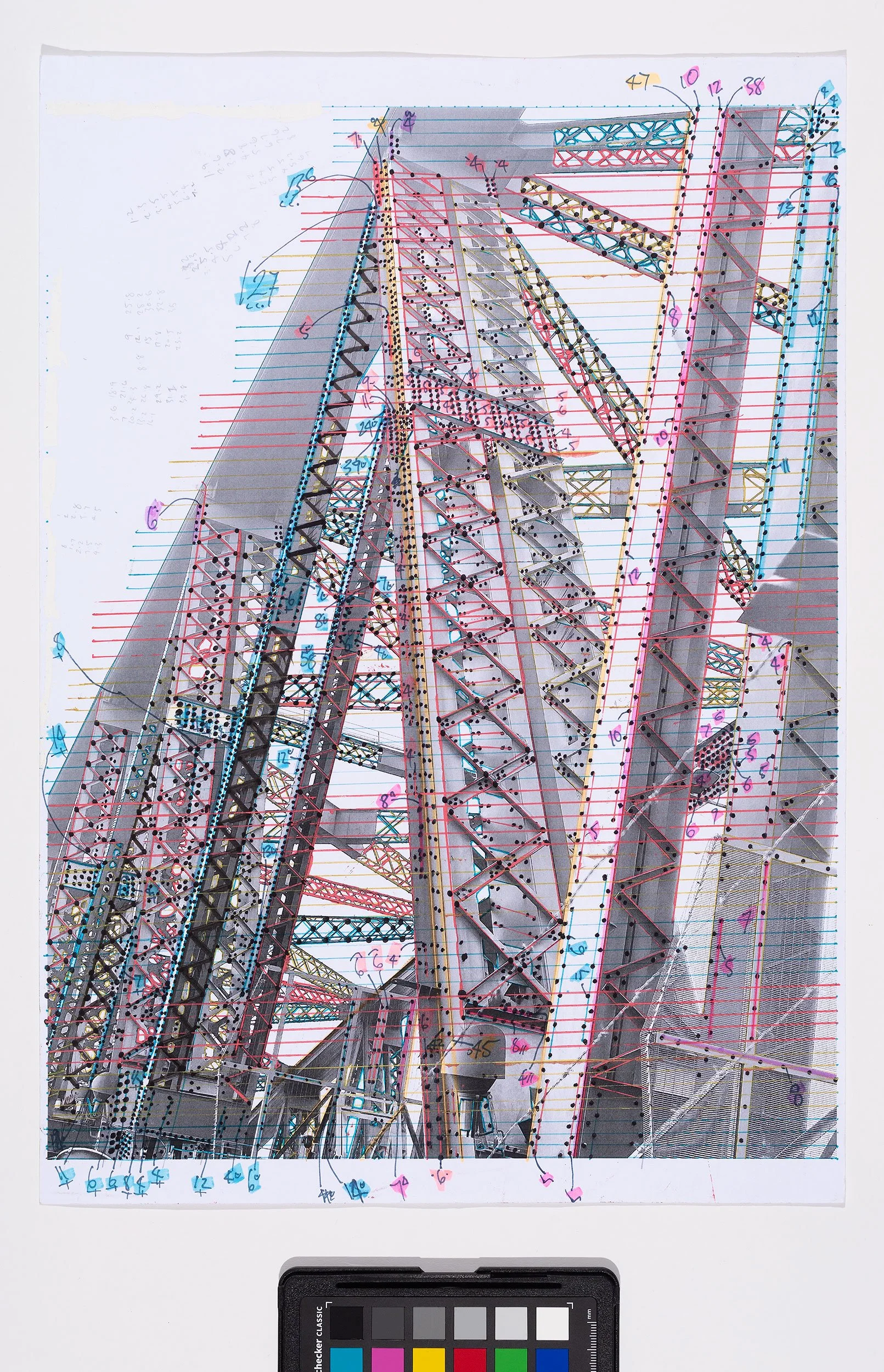 Mia Salsjö, The Bridge: A Score for Sydney Harbour Bridge, 2023, works on paper and overworked photographic prints, from the suite of images originally commissioned by the Department of Public Works, circa 1922-1932, accessed through the archive of the Powerhouse Museum, Sydney.
